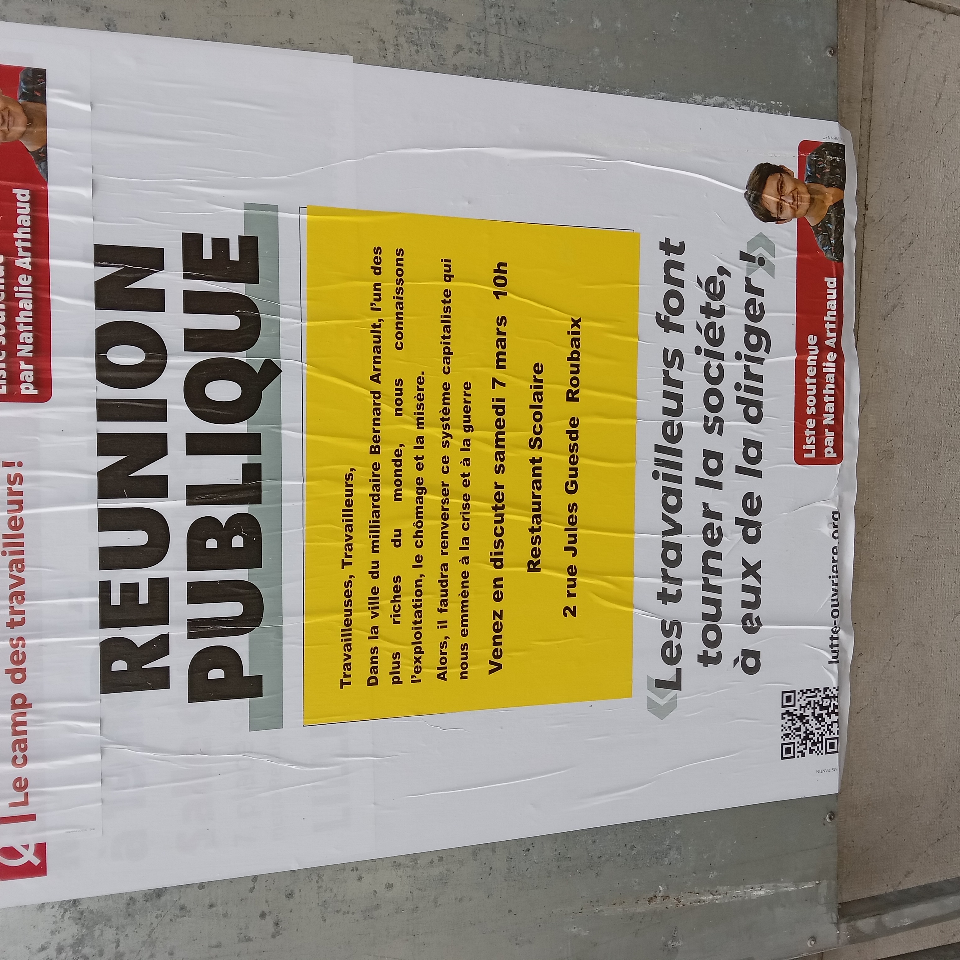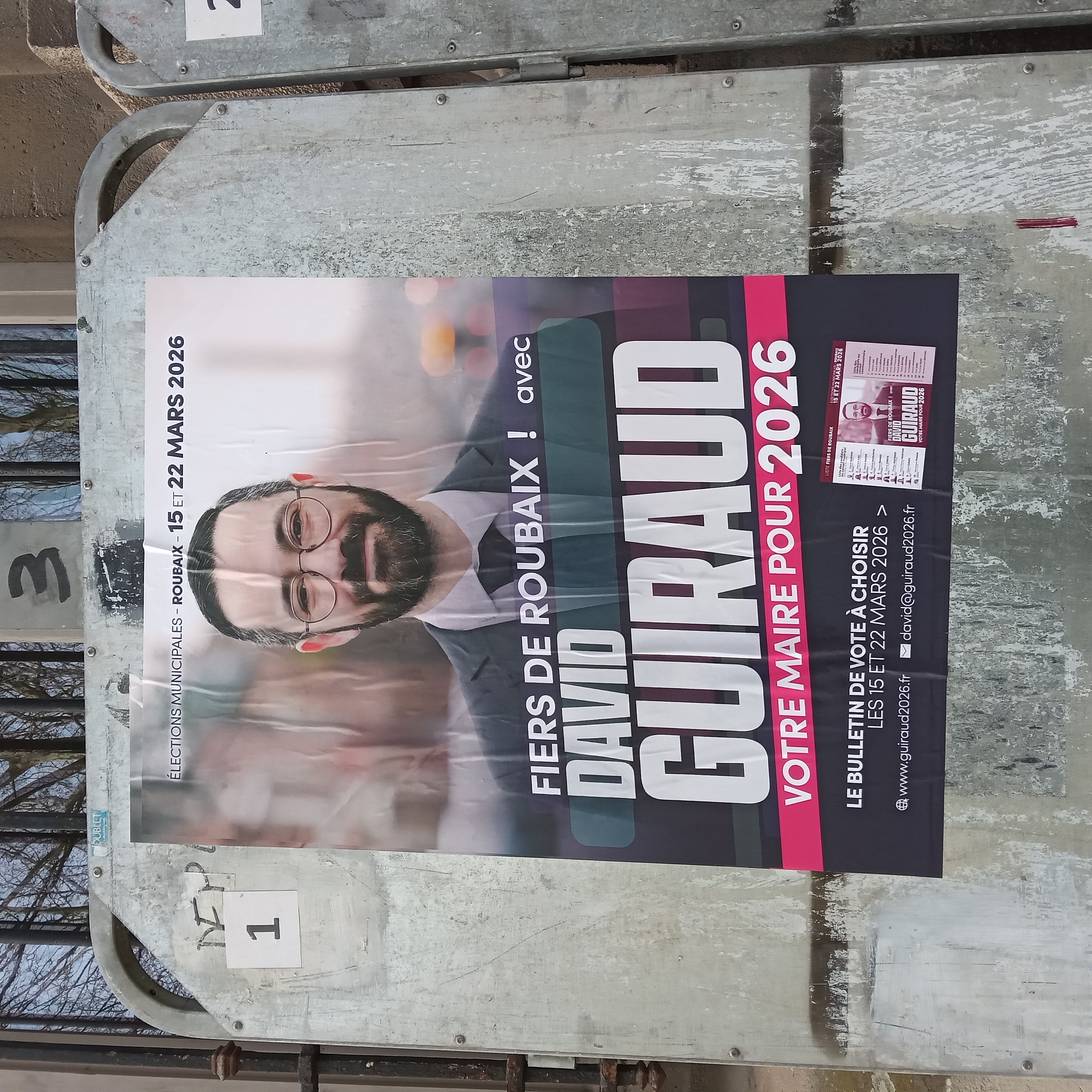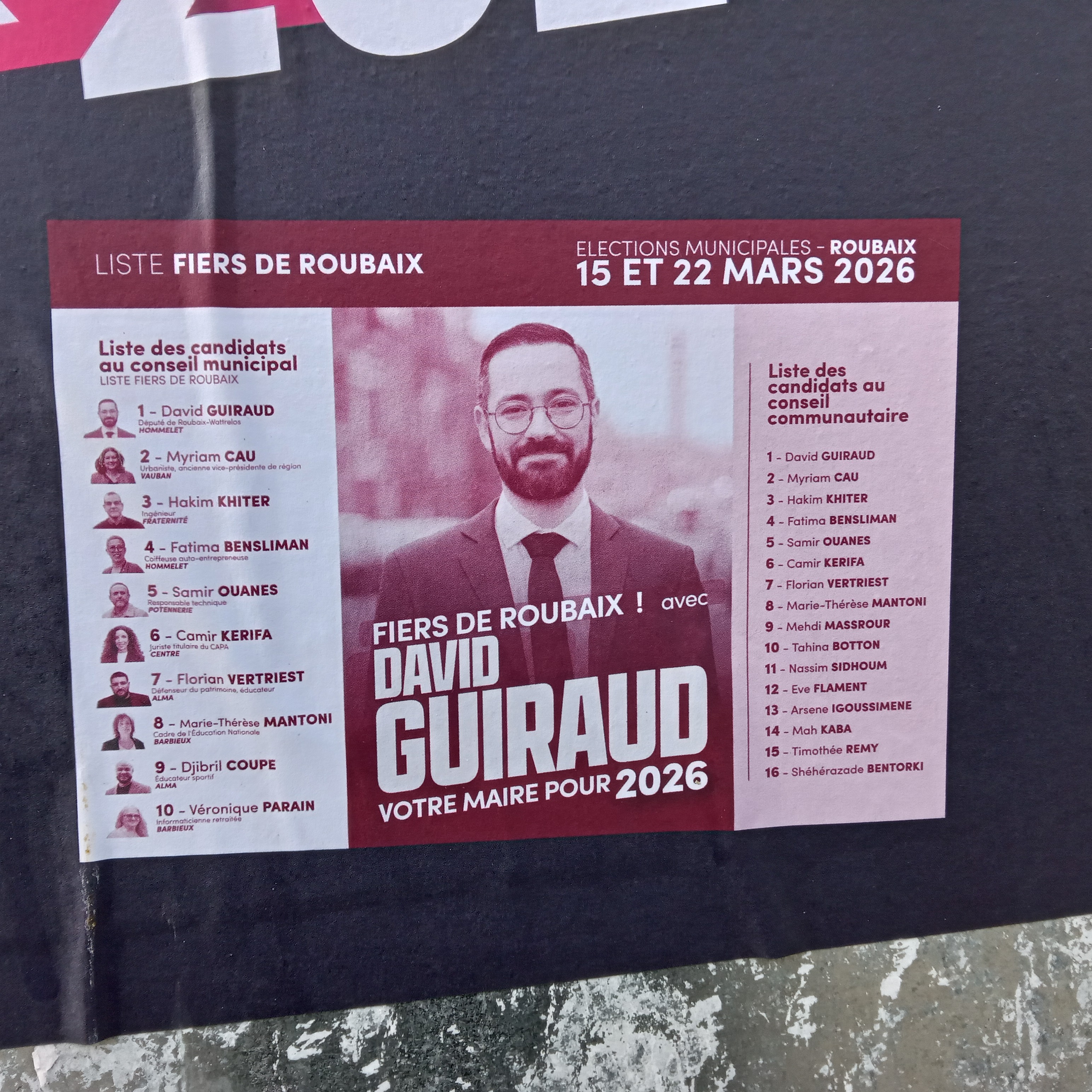 | 13 mars 2026 à 11:05 | Guiraud2026a.jpg (fichier) | 2,15 Mio | Pylambert | photo: P.Y. Lambert 8 mars 2026 (panneau officiel à gauche de la mairie, côté place) Catégorie:Roubaix 2026 | 1 | |