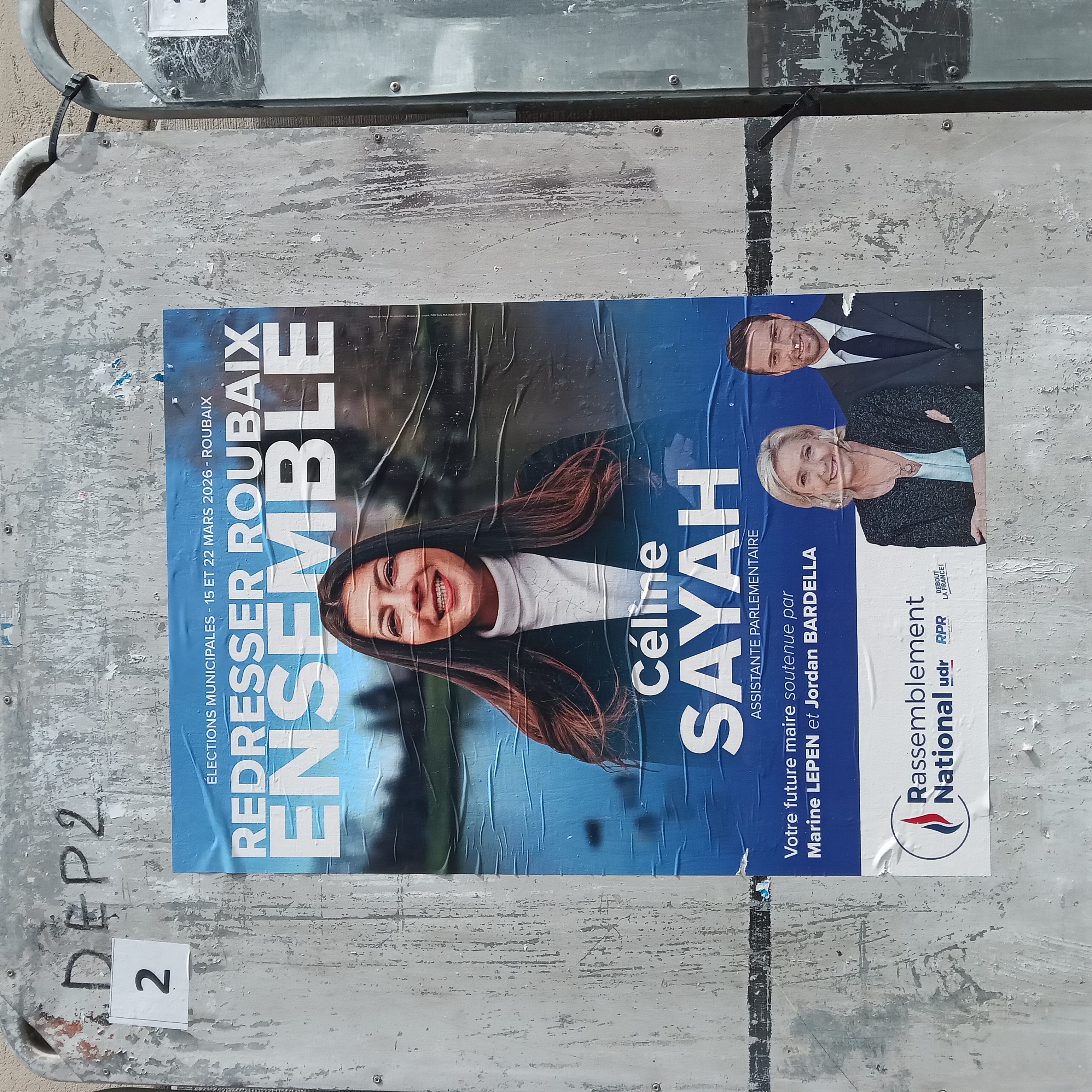 | 13 mars 2026 à 11:07 | Sayah2026.jpg (fichier) | 2,55 Mio | Pylambert | photo: P.Y. Lambert 8 mars 2026 (panneau officiel à droite de la mairie, côté rue; l'affiche sur le panneau côté place avait été vandalisée avec une moustache hitlérienne) Catégorie:Roubaix 2026 | 1 | |